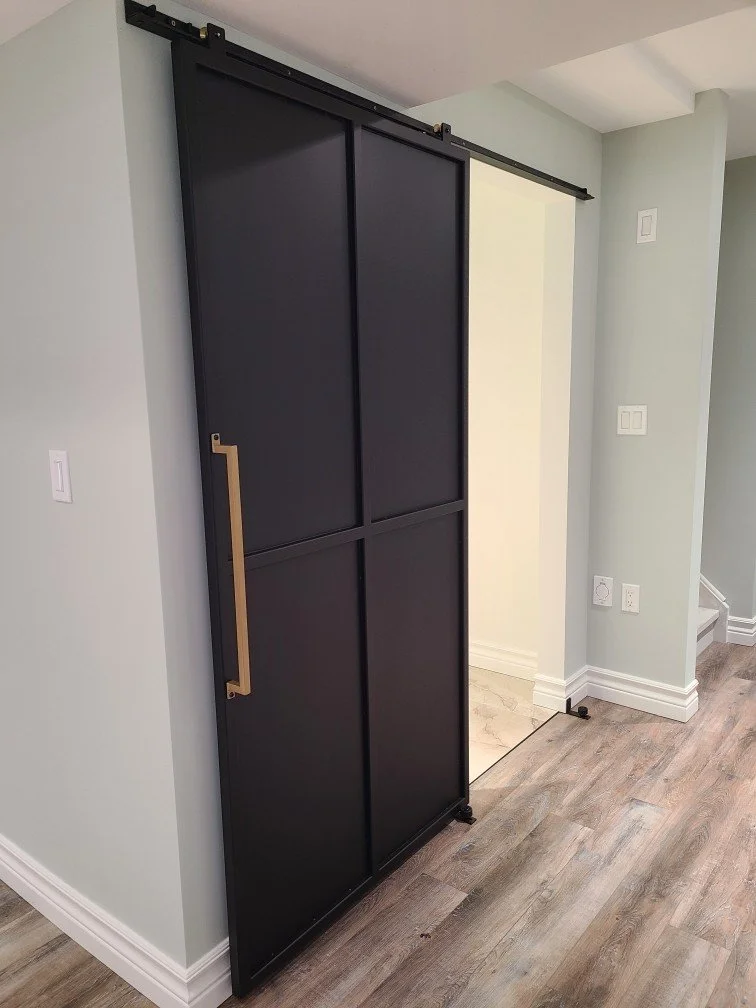 Custom matte black metal barn door designed and built by Jrod Welding & Design for a bold, modern look.